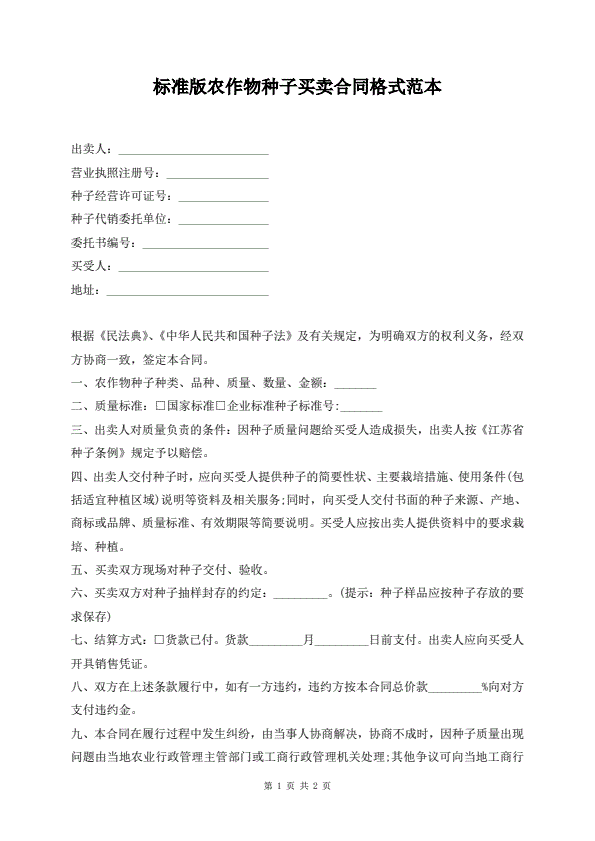 标准版农作物种子买卖合同格式范本