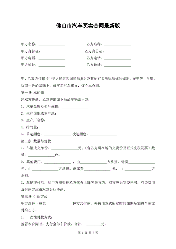 佛山市汽车买卖合同最新版