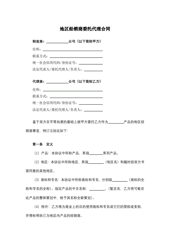 地区经销商委托代理合同