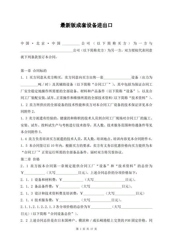 进口成套设备买卖协议书