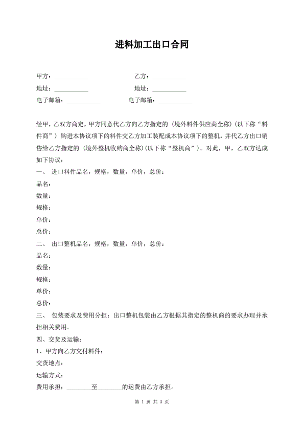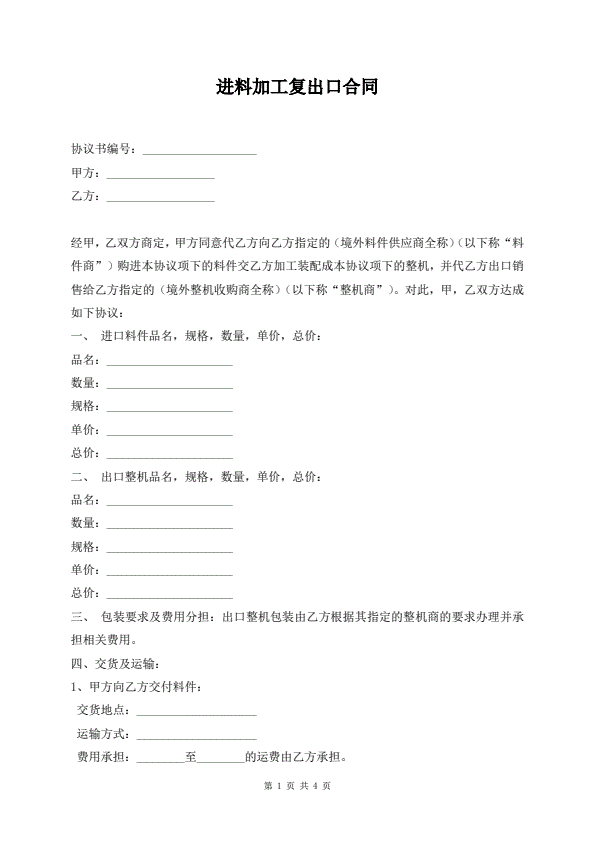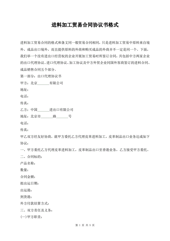进料加工贸易合同协议书格式