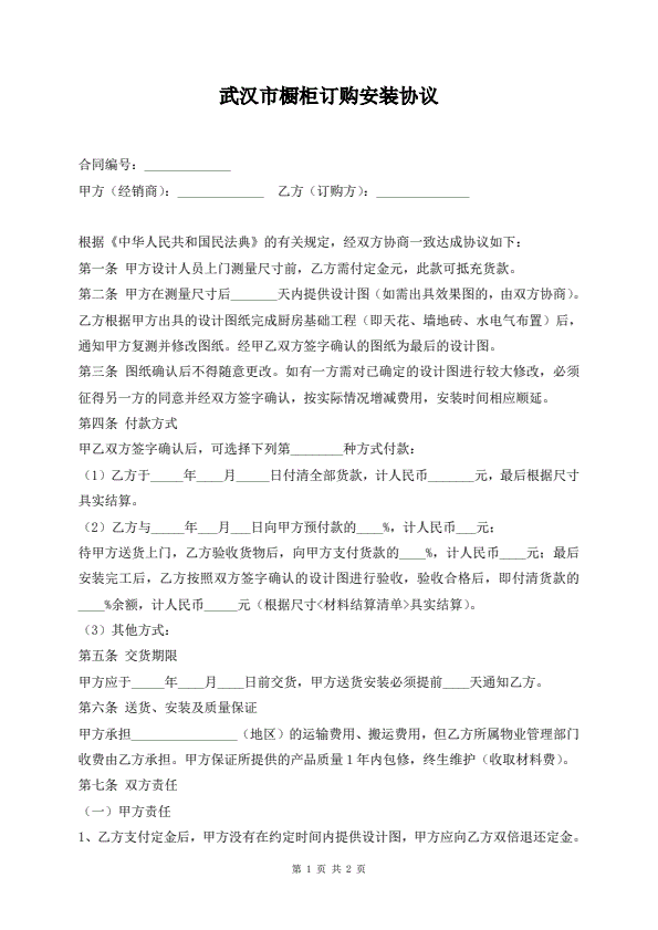 武汉市橱柜订购安装协议