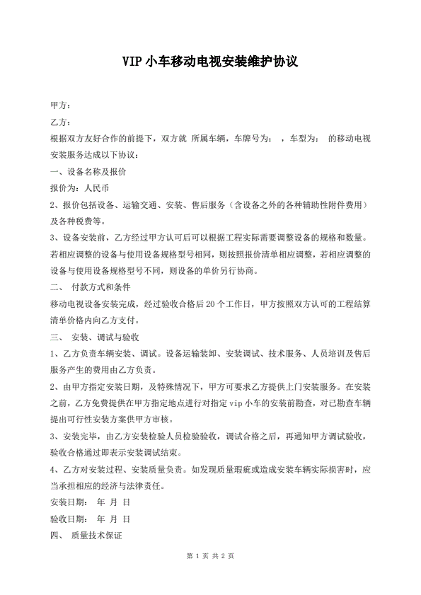 VIP小车移动电视安装维护协议