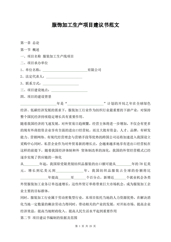 服饰加工生产项目建议书范文